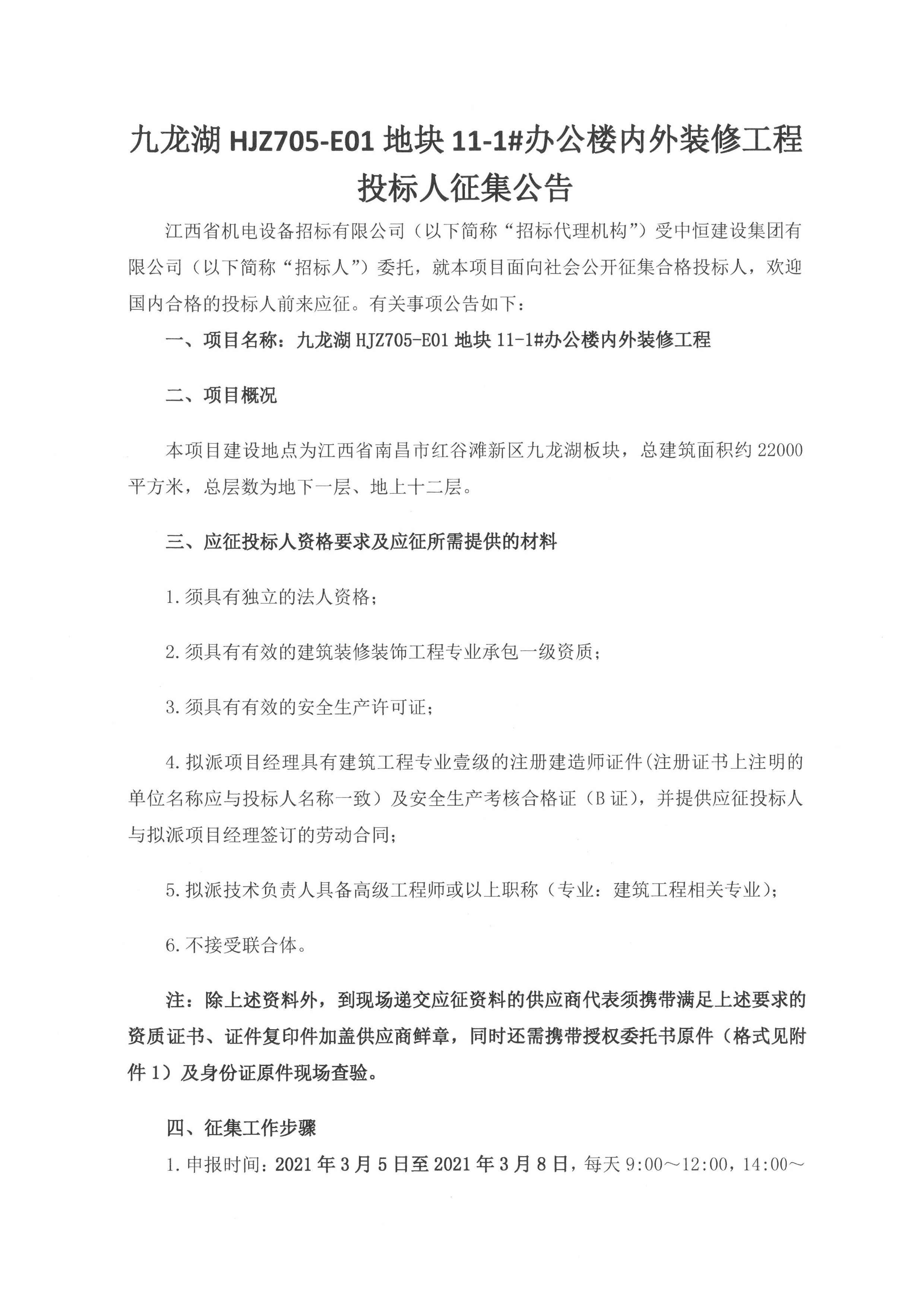 九龙湖HJZ705-E01地块11-1#办公楼内外装修工程投标人征集通告